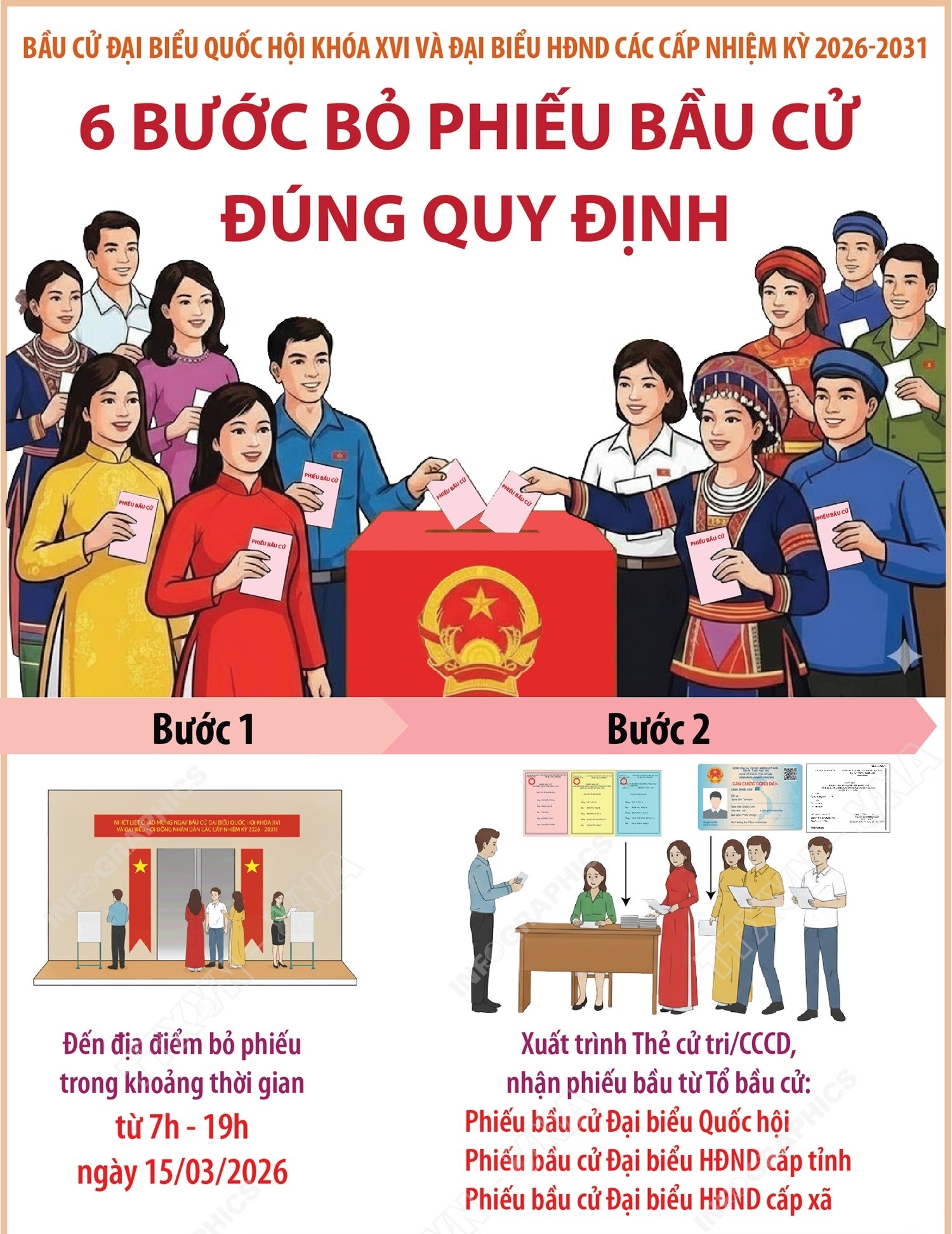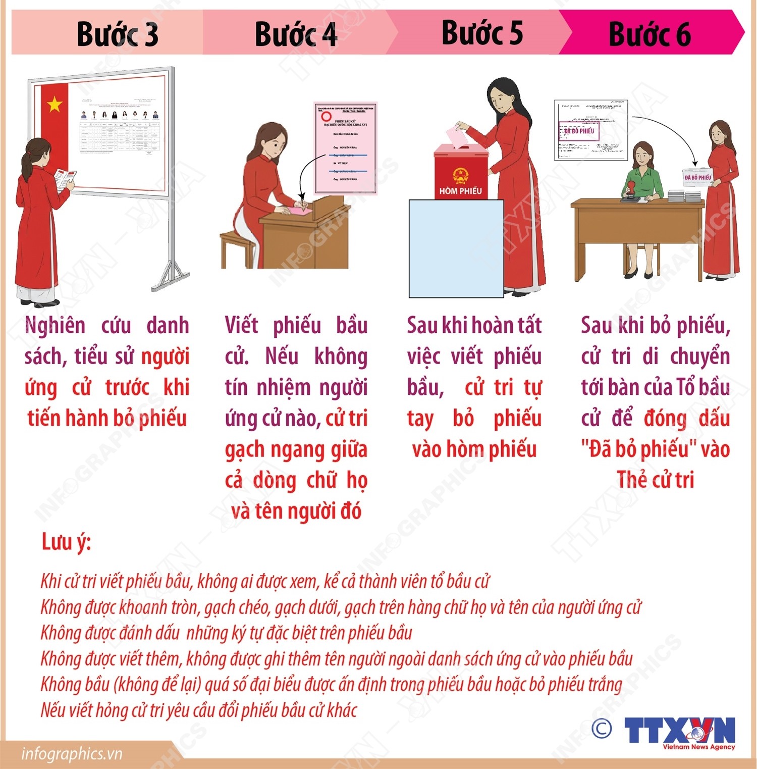 Nguồn: Thông tấn xã Việt Nam (Bầu cử Quốc hội và HĐND: 6 bước bỏ phiếu bầu cử đúng quy định)